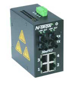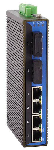 6 porttiset kupari / optiset ethernet kytkimet (switch) teollisuusympäristöön DIN-kisko kiinnityksellä ja 10-30VDC tehonsyötöllä.