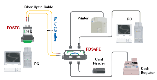 Optional power supplies are available. Model FOSTDRP is a fiber-to-fiber duplex repeater. It squares off and amplifies the fiber signal, doubling its range and overcoming fiber loss and connector loss